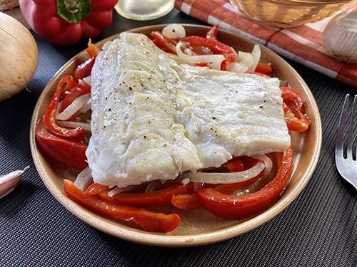 Comenzamos la elaboración de nuestro bacalao al horno, para ello, precalentamos el horno a 180º C, luego en un recipiente apto para horno agregamos los pimientos, la cebolla, el ajo, un poco de aceite de oliva, sal, seguidamente incorporamos los lomos de bacalao, agregamos el vino blanco y cocinamos en el horno por 20 minutos, pasados este tiempo ya tenemos listo nuestro riquísimo bacalao al horno.