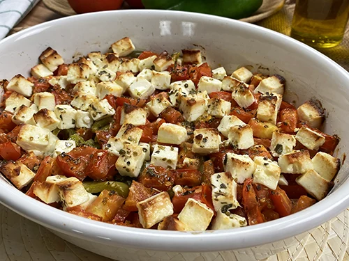 Comenzamos la elaboración de nuestro buyurdi griego, para ello, en una fuente apta para horno, agregamos el pimiento rojo, el pimiento verde, el tomate, un poco de sal, el orégano, un buen chorro de aceite de oliva y llevamos al horno a 200º C por 20 minutos o hasta ver que las verduras estén hechas y el queso tome un aspecto dorado.