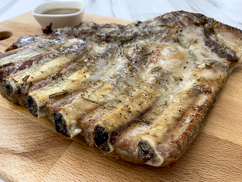 Paso 2: Colocamos nuestras costillas en una bandeja apta para horno, las bañamos con nuestro majado de ajo y romero y las untamos con el majado por todo sus lados. Finalmente llevamos al horno a 180 ºC por 1 hora, pasado el tiempo de cocinado, retiramos del horno, dejamos reposar las costillas 5 minutos, picamos y servimos.