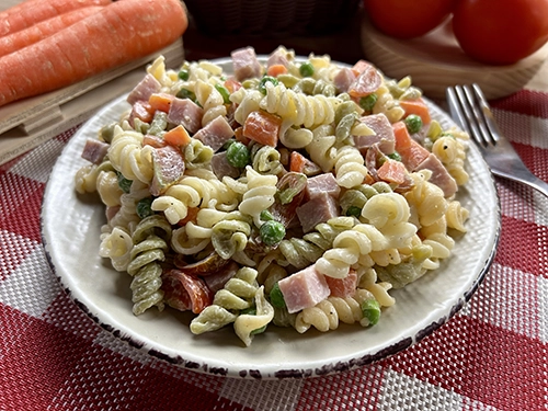 Paso 1: Comenzamos la preparación de nuestra ensalada de fideos, para ello, en un bol agregamos la pasta, los guisantes, la zanahoria, los tomates, el jamón, la mayonesa, un poco de sal y pimienta, removemos hasta que todos los ingredientes queden completamente integrados, servimos y ya solo nos queda disfrutar de nuestra deliciosa ensalada de fideos.