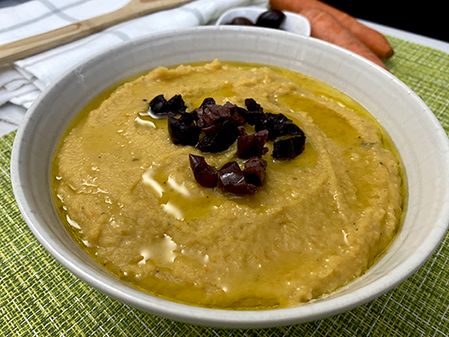Podemos servir nuestra fava griega con aceitunas negras o aceitunas kalamata, alcaparras, tomates cherry y cebollas.