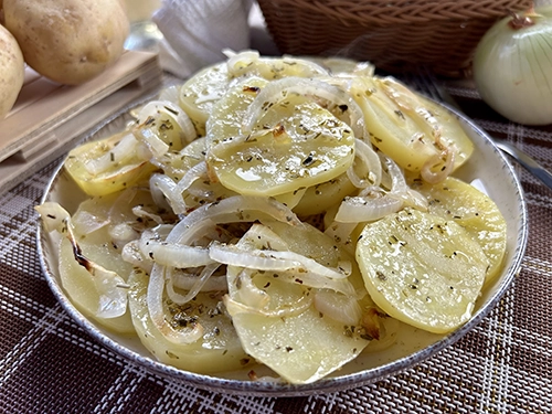 Estas ricas patatas al horno con cebolla son una perfecta guarnición para nuestros platos de comida como pollo, pescado, aves…