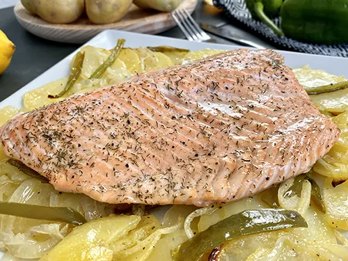 Hoy te vamos a enseñar a preparar una de las recetas más fáciles con salmón, se trata del salmón al horno con patatas, una receta que de sencilla lo tiene todo, además es un plato muy saludable y gracias a que es un pescado graso, queda muy jugoso y con un sabor espectacular.