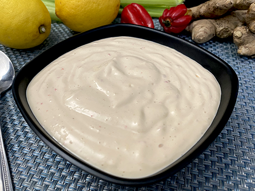Para finalizar, agregamos el apio, el jengibre, el ajo, el ají, el caldo de pescado, el zumo de limón, la salsa de soja y batimos nuevamente hasta integrar todo los ingredientes.