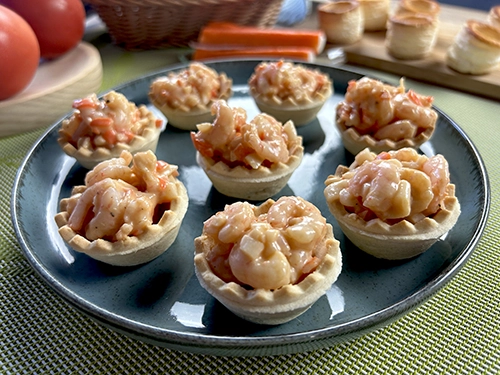 Comenzamos la preparación de nuestra receta, para ello, en un bol incorporamos las gambas, el surimi, el tomate frito, la mayonesa, la salsa perrins, un poco de sal y pimienta, removemos, seguidamente en cada una de las tartaletas agregamos un poco de la mezcla y ya tenemos listas nuestras deliciosas tartaletas de cóctel de gambas.