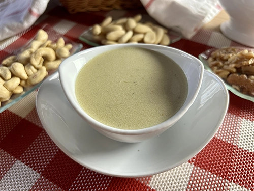 Comenzamos la preparación de nuestra vinagreta de frutos secos, para ello, en el vaso de una batidora de mano agregamos las almendras, las nueces, los anacardos, el vinagre, el aceite de oliva, un poco de sal, un poco de pimienta, procesamos hasta obtener una textura ligera y ya tenemos lista nuestra rica vinagreta de frutos secos.